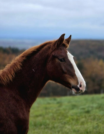 Poulain mâle alezan, né le 19 avril 2025, doté de beaucoup de blanc et d’une prestance naturelle qui attire immédiatement le regard.